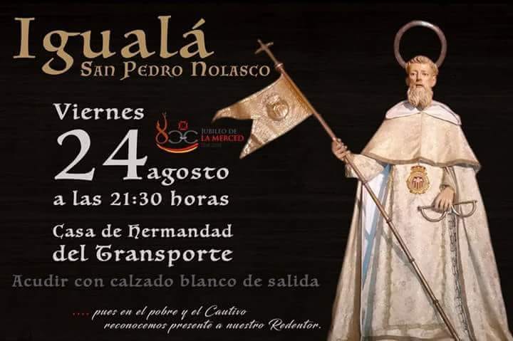 El próximo 24 de agosto será la igualá de costaleros para la salida procesional de San Pedro Nolasco, fundador de la Orden de la Merced, que saldrá en procesión junto a la Patrona el 24 de septiembre, con motivo del VIII Centenario de la Fundación de dicha orden mercedaria. Será en nuestra Casa de Hermandad a las 21:30h.