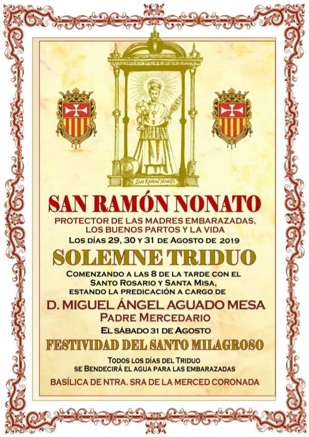 Los próximos días 29, 30 y 31 de agosto tendrá lugar el triduo a San Ramon Nonato, patrón y protector de las mujeres embarazadas, de los partos y de la vida.