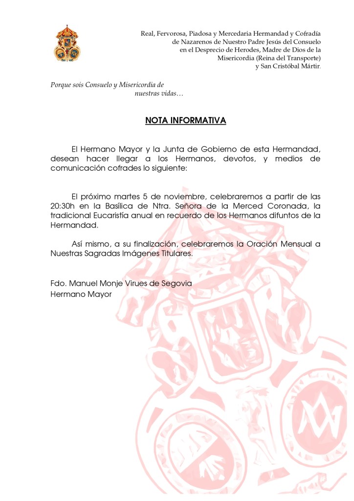 30 octubre, 201930 octubre, 2019 P.M. La misa en honor de nuestros Hermanos difuntos será el próximo martes Comparte esto:Tweet Compartir en WhatsApp (Se abre en una ventana nueva) WhatsApp Compartir en Telegram (Se abre en una ventana nueva) Telegram Imprimir (Se abre en una ventana nueva) Imprimir Email a link to a friend (Se abre en una ventana nueva) Correo electrónico Me gusta Cargando... Relacionado