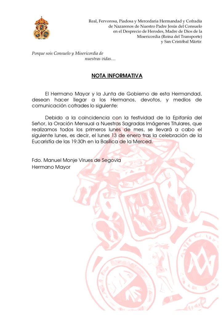 3 enero, 2020 P.M. La Oración Mensual a nuestros Sagrados Titulares se pospone al 13 de enero Comparte esto:Tweet Compartir en WhatsApp (Se abre en una ventana nueva) WhatsApp Compartir en Telegram (Se abre en una ventana nueva) Telegram Imprimir (Se abre en una ventana nueva) Imprimir Email a link to a friend (Se abre en una ventana nueva) Correo electrónico Me gusta Cargando... Relacionado