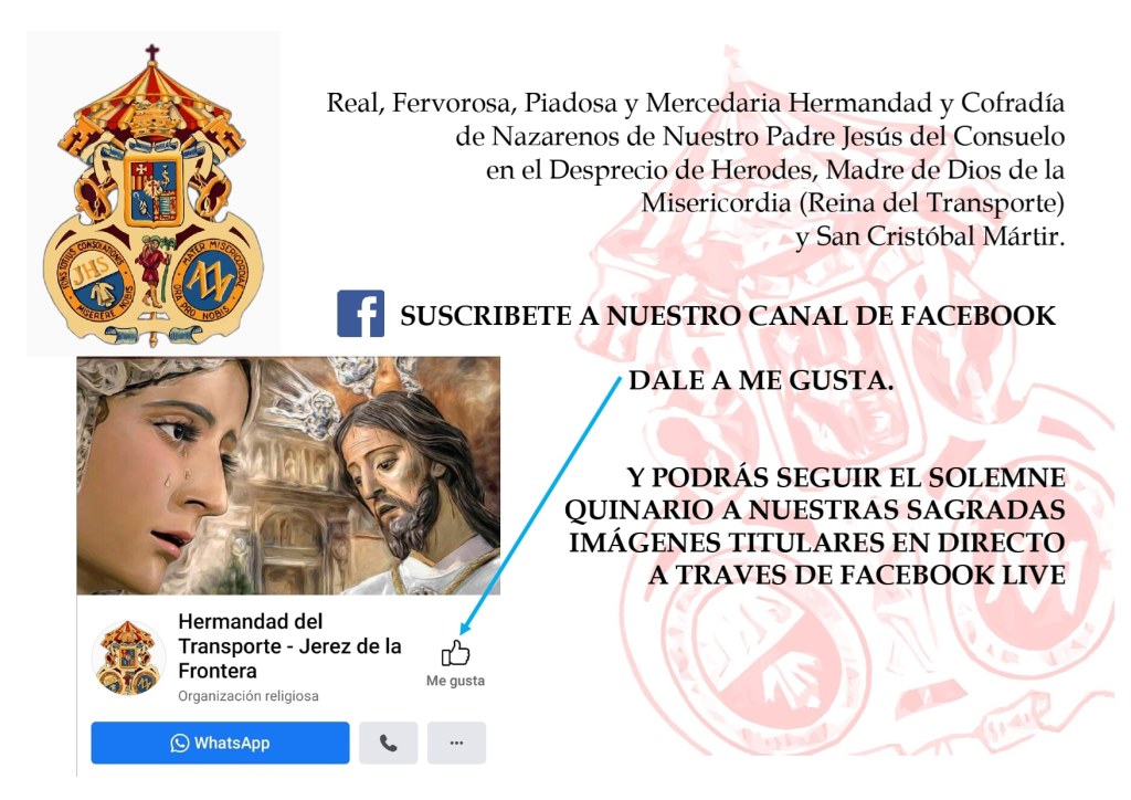 Comunicamos que el Solemne Quinario a nuestras Sagradas Imágenes Titulares, que comenzará el próximo 17 de febrero, Miércoles de Ceniza, serán ofrecidos en directo por Facebook Live.