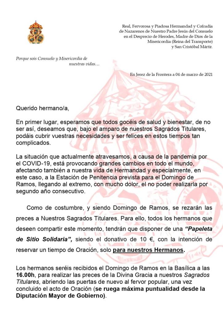 La situación que actualmente atravesamos, a causa de la pandemia por el COVID-19, está provocando grandes cambios en todo el mundo, afectando también a nuestra vida de Hermandad y especialmente, en este caso, a la Estación de Penitencia prevista para el Domingo de Ramos, llegando al extremo, con mucho dolor, el no poder realizarla por segundo año consecutivo.