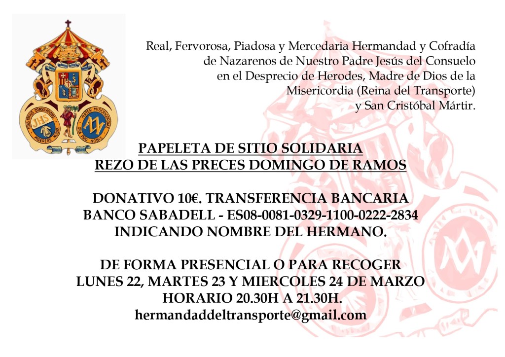 Desde hoy lunes 22, hasta el miércoles 24 de marzo se abre el periodo de reparto y recogida de las Papeletas de sitio solidarias para poder asistir el próximo Domingo de Ramos al rezo de las preces ante nuestros Sagrados Titulares. El horario será de 20.30h a 21.30h.
