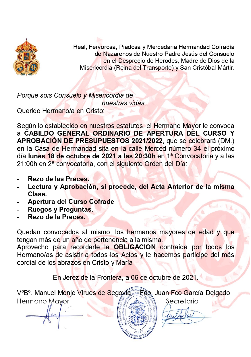 Según lo establecido en nuestros estatutos, el Hermano Mayor le convoca a CABILDO GENERAL ORDINARIO DE APERTURA DEL CURSO Y APROBACIÓN DE PRESUPUESTOS 2021/2022, que se celebrará (DM.) en la Casa de Hermandad sita en la calle Merced número 34 el próximo día lunes 18 de octubre de 2021 a las 20:30h en 1ª Convocatoria y a las 21:00h en 2ª convocatoria, con el siguiente Orden del Día: