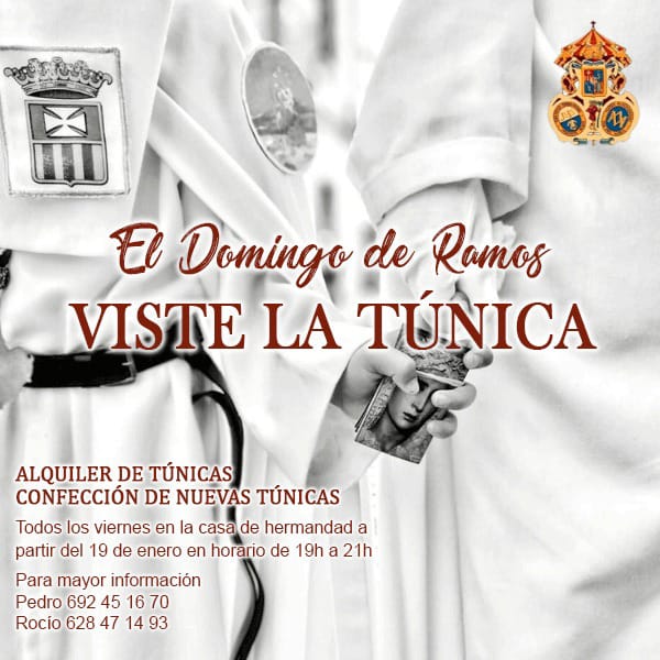 Y de la Túnica no te preocupes, te la alquilamos o te la confeccionamos en nuestro taller de costura todos los viernes a partir del 19 de enero en nuestra Casa de Hermandad en horario de 19h a 21h.