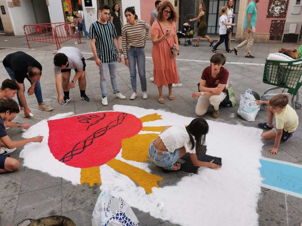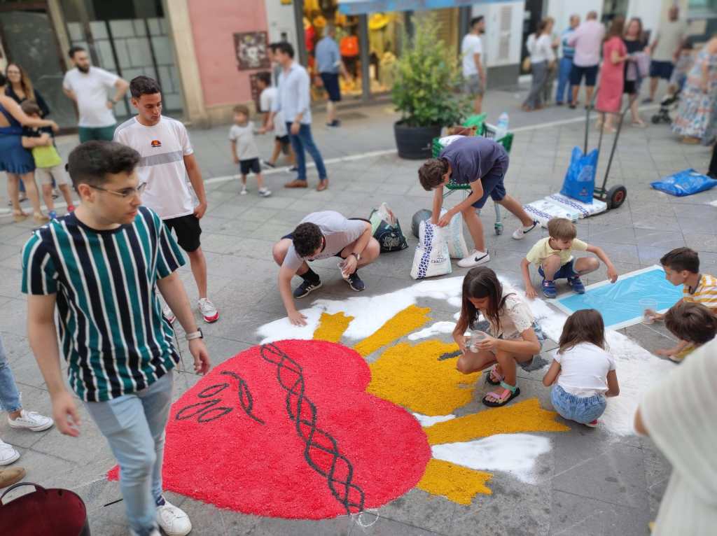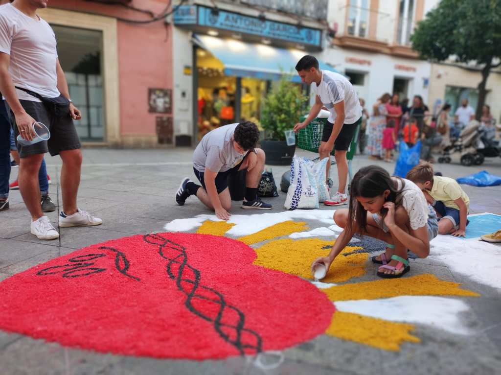 Los niños y jóvenes de nuestra Hermandad comenzaron con la elaboración del motivo principal de la alfombra, que no era otro que el Sagrado Corazón de Jesús, del que en este año 2022 se celebran los 100 años de su consagración. Detalles como las llagas de donde brota sangre, la corona de espinas, los destellos y la cruz fueron perfilados en su interior.
