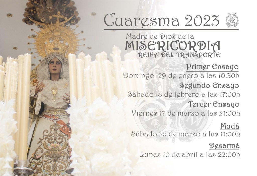 Damos a conocer el calendario de los ensayos que llevará a cabo la cuadrilla del paso de palio de Madre de Dios de la Misericordia, comandada por Jaime Racero Vallés y su equipo.