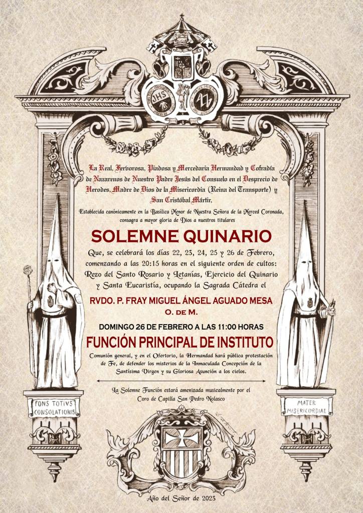 Por medio de la presente damos a conocer el cartel de la convocatoria del Solemne Quinario y Función Principal de Instituto que celebraremos en la Basílica de la Merced desde el 22 de febrero, miércoles de ceniza, hasta el domingo 26 de febrero.
