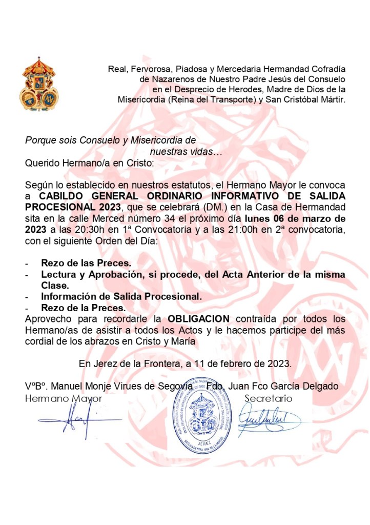 Por medio de la presente os hacemos llegar la convocatoria del Cabildo General Ordinario Informativo de Salida Procesional 2023, que se llevará a cabo el próximo lunes día 6 de Marzo en nuestra Casa de Hermandad, a las 20.30h en primera y a las 21h en segunda convocatoria.