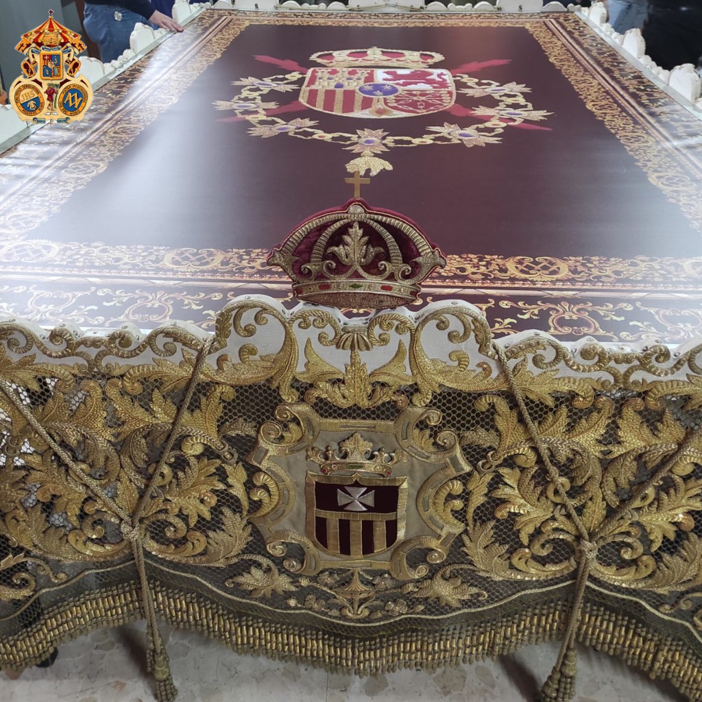 Tal y como se ve en la fotografía, el sobre techo del Paso de palio es de color burdeos con el escudo de la Casa Real.