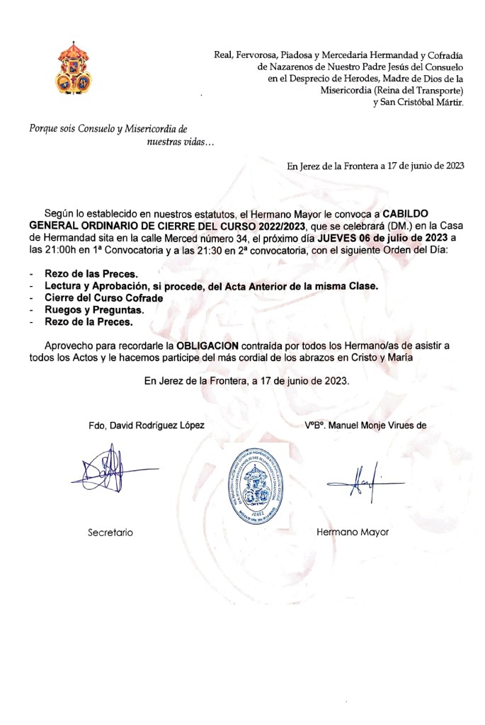 El próximo jueves 06 de Julio, celebraremos en nuestra Casa de Hermandad, Cabildo General Ordinario de Cierre de Cuentas y Fin de Curso 2022-2023 a las 21h en primera y a las 21:30h en segunda convocatoria.