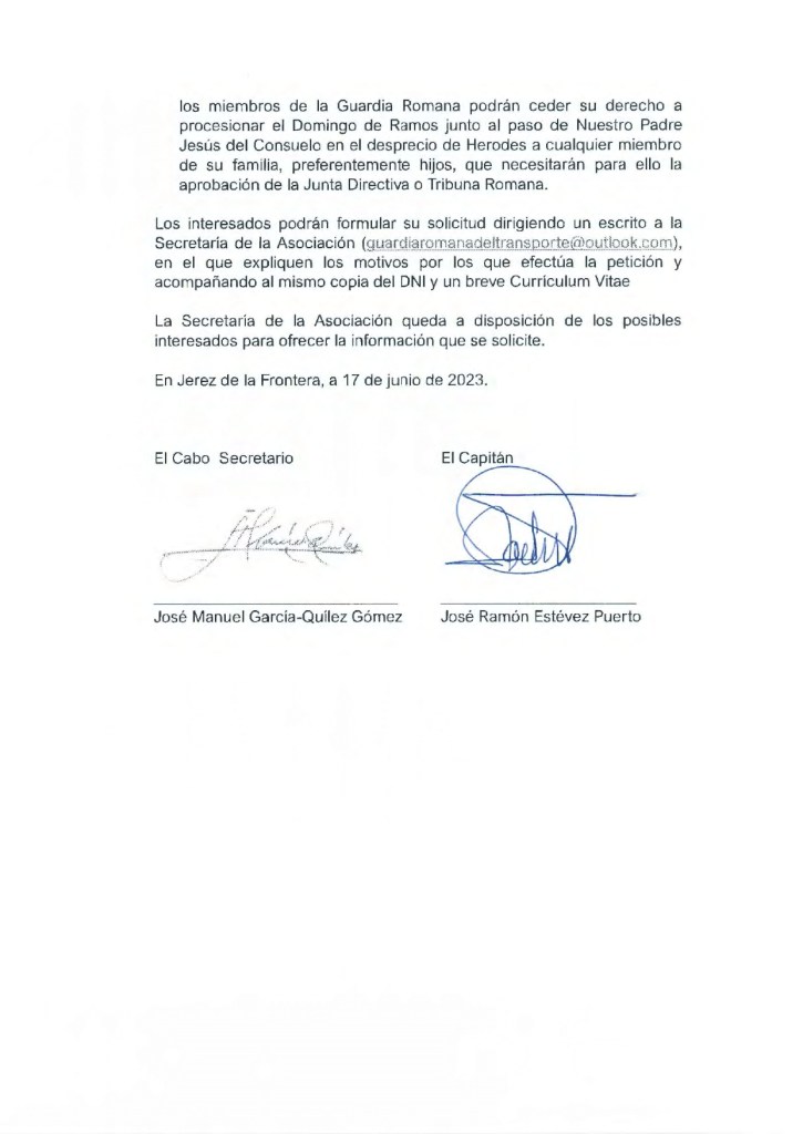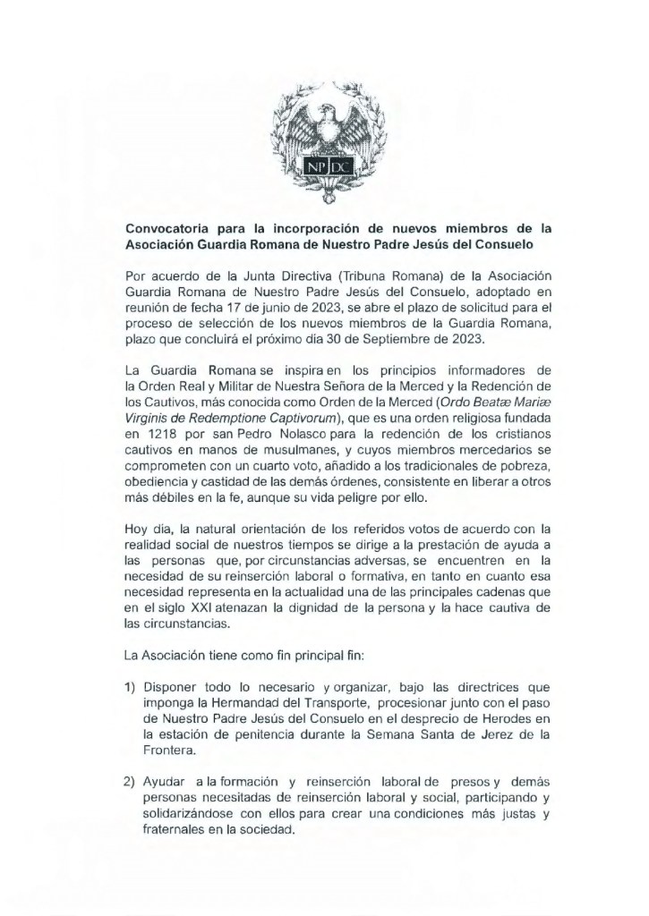 Por acuerdo de la Junta Directiva (Tribuna Romana) de la Asociación Guardia Romana de Nuestro Padre Jesús del Consuelo, adoptado en reunión de fecha 17 de junio de 2023, se abre el plazo de solicitud para el proceso de selección de los nuevos miembros de la Guardia Romana, plazo que concluirá el próximo día 30 de Septiembre de 2023.
