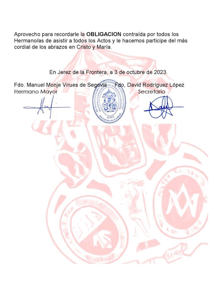 Aprovecho para recordarle la OBLIGACION contraída por todos los Hermano/as de asistir a todos los Actos y le hacemos participe del más cordial de los abrazos en Cristo y María.