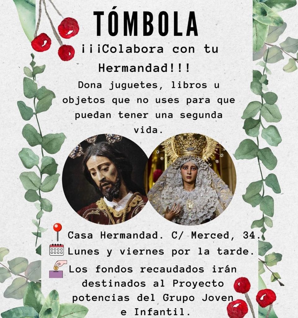 Durante el dia de celebración de la tradicional Zambomba Navideña que cada año organiza nuestra Hermandad, se llevará a cabo una Tómbola, siendo la misma gestionada por nuestro Grupo Joven.