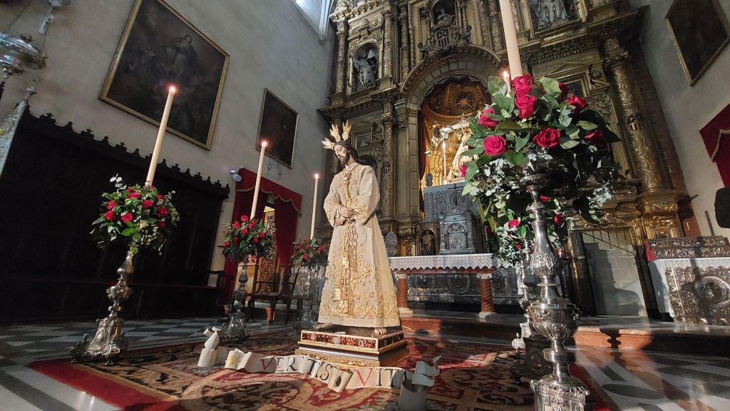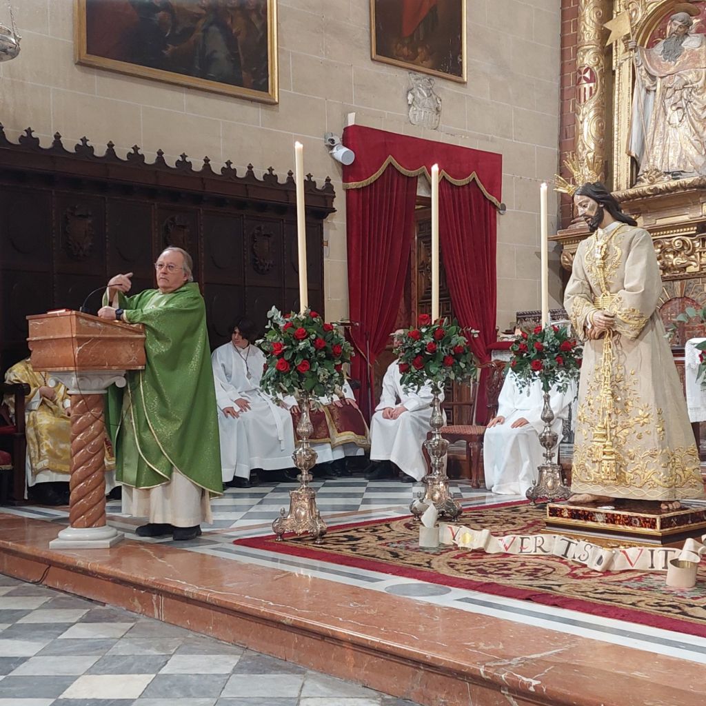 A las 19h dió comienzo la Solemne Eucaristía de Reposición al culto de nuestra imagen titular crístifera, presidida por nuestro Director Espiritual Don Fray Felipe Ortuno Marchante, Comendador de la Basílica, y con la asistencia de muchos Hermanos y devotos, y con representación del Consejo Local de Hermandades y Cofradías, de Hermandad cercanas, de la Banda de la Centuria Romana y del propio restaurador.