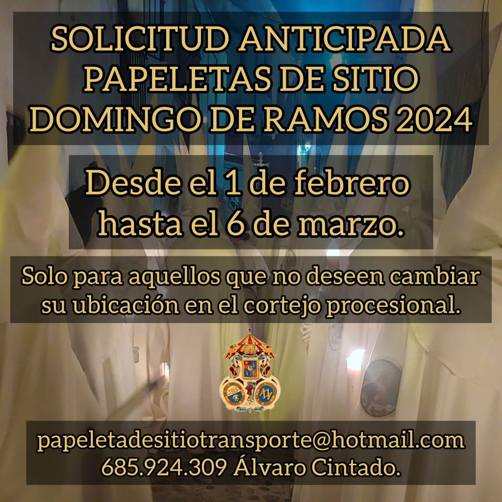 Si no deseas cambiar tu ubicación en el cortejo procesional, puedes solicitar de forma anticipada tu Papeleta de Sitio para el próximo Domingo de Ramos 2024.