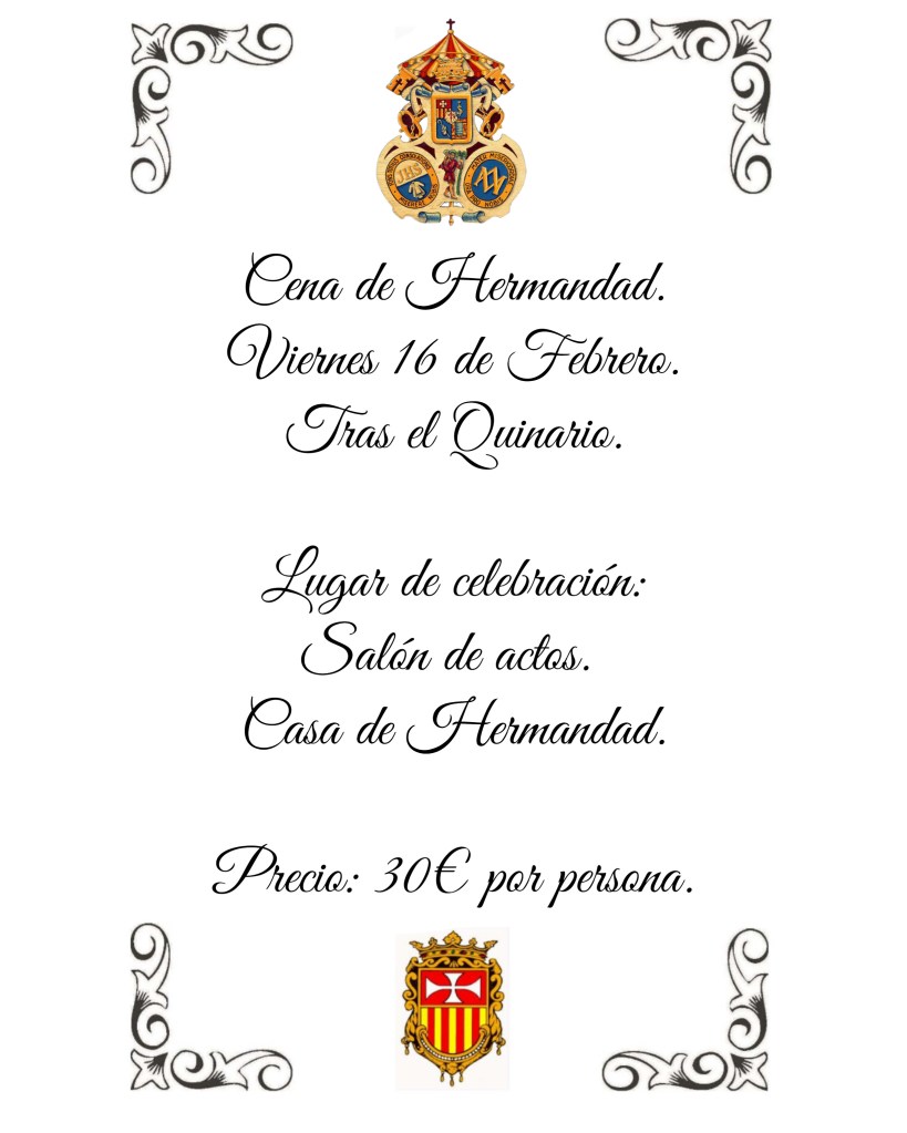 Como bien sabéis, el próximo miércoles 14 de febrero, miércoles de ceniza, comenzará el Solemne Quinario a nuestros Sagrados Titulares, que concluirá el domingo, primer domingo de Cuaresma, con la Función Principal de nuestra Hermandad.