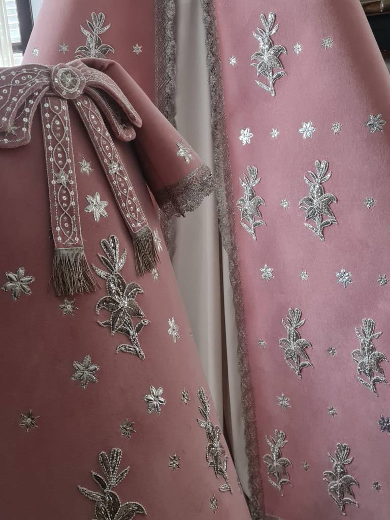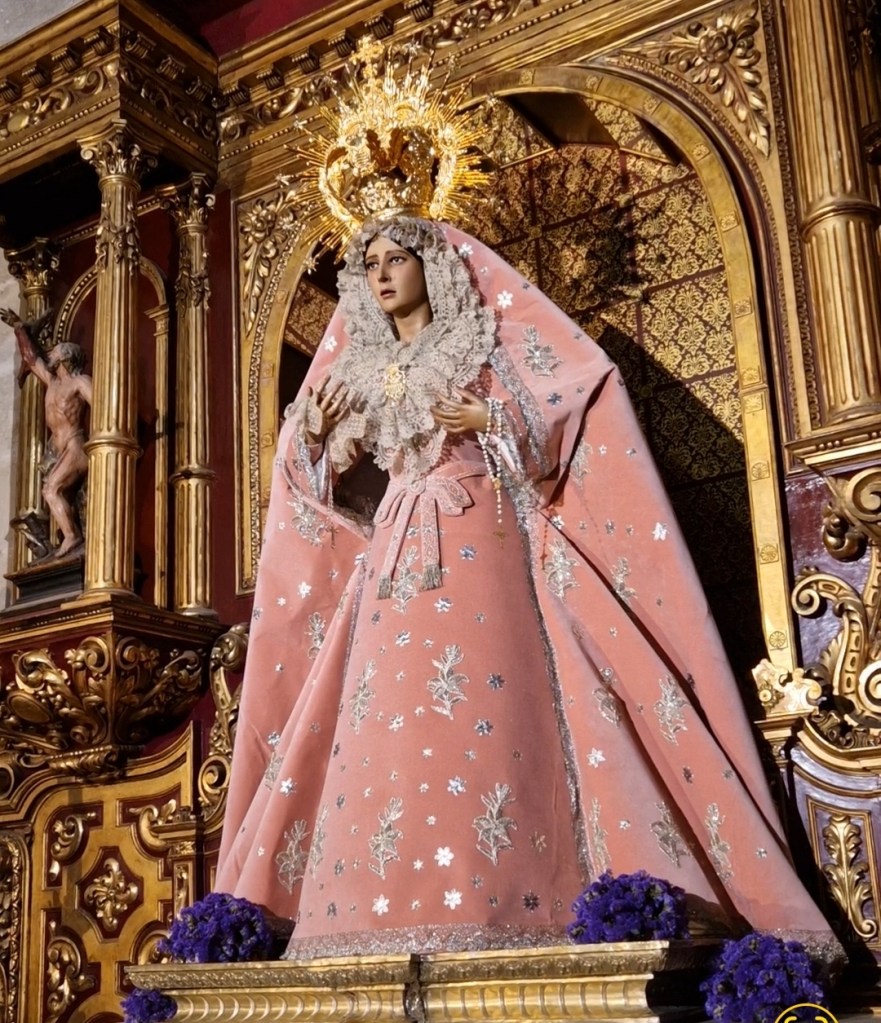 Nuestra amantísima titular Madre de Dios de la Misericordia luce desde el primer Domingo de Cuaresma el conjunto de manto y saya para Camarín color rosa, realizados por José Segura, en su Taller de Bordados Costura Sacra.