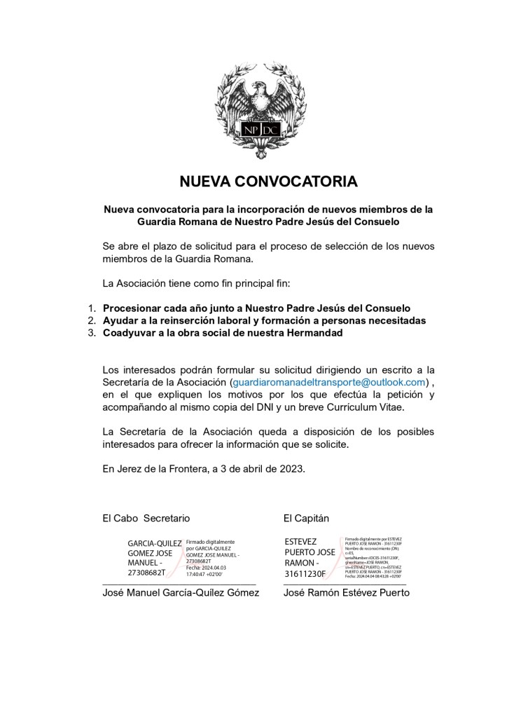 Por acuerdo de la Junta Directiva (Tribuna Romana) de la Asociación Guardia Romana de Nuestro Padre Jesús del Consuelo, se abre el plazo de solicitud para el proceso de selección de los nuevos miembros de la Guardia Romana.