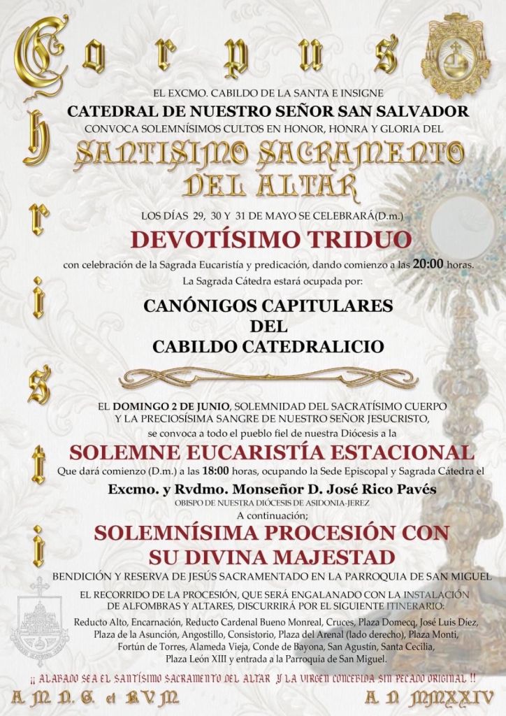 Se informa a todos los hermanos que deseen acompañar al Santísimo Sacramento, que deberán estar en la Santa Iglesia Catedral a las 18 horas el próximo domingo, día 2 de junio, para el comienzo de la Eucaristía de la Solemnidad del Santísimo Cuerpo y Sangre de Cristo y posterior Solemnísima Procesión de su Divina Majestad.