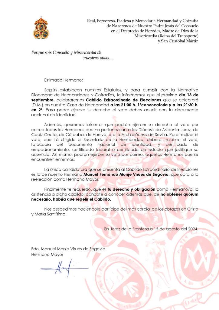 La única candidatura que se presenta al Cabildo Extraordinario de Elecciones es la de nuestro Hermano Manuel Fernando Monje Virues de Segovia, que opta a la reelección como Hermano Mayor.