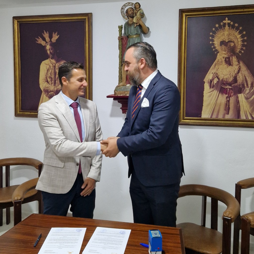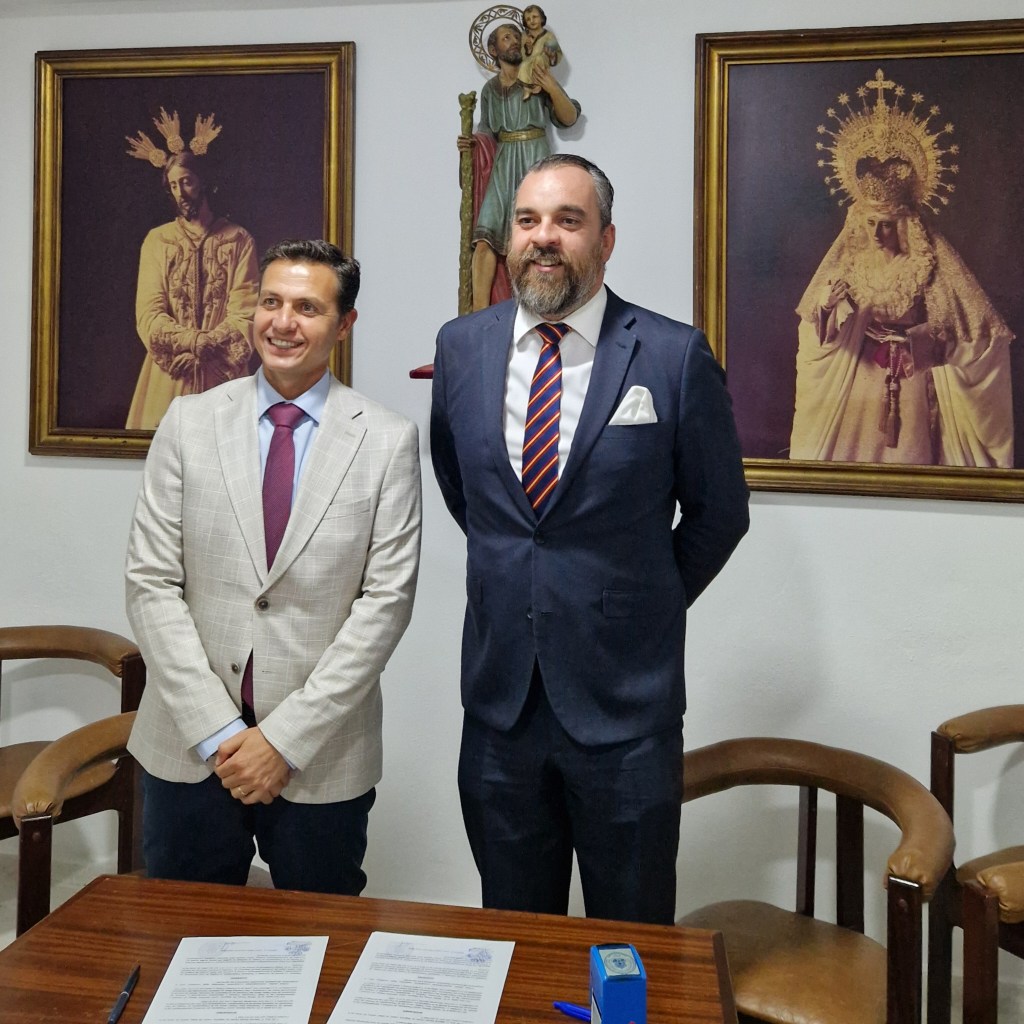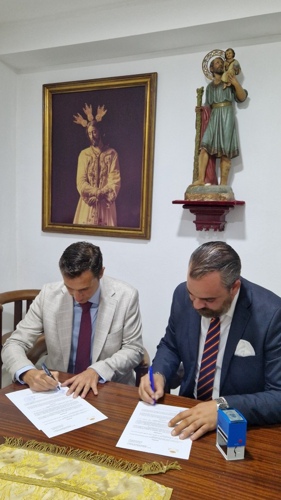 Nuestro Hermano Mayor junto al Presidente de la Junta Directiva de la Banda, Daniel Núñez sellaron el contrato en la Sala de Juntas de nuestra Casa de Hermandad.