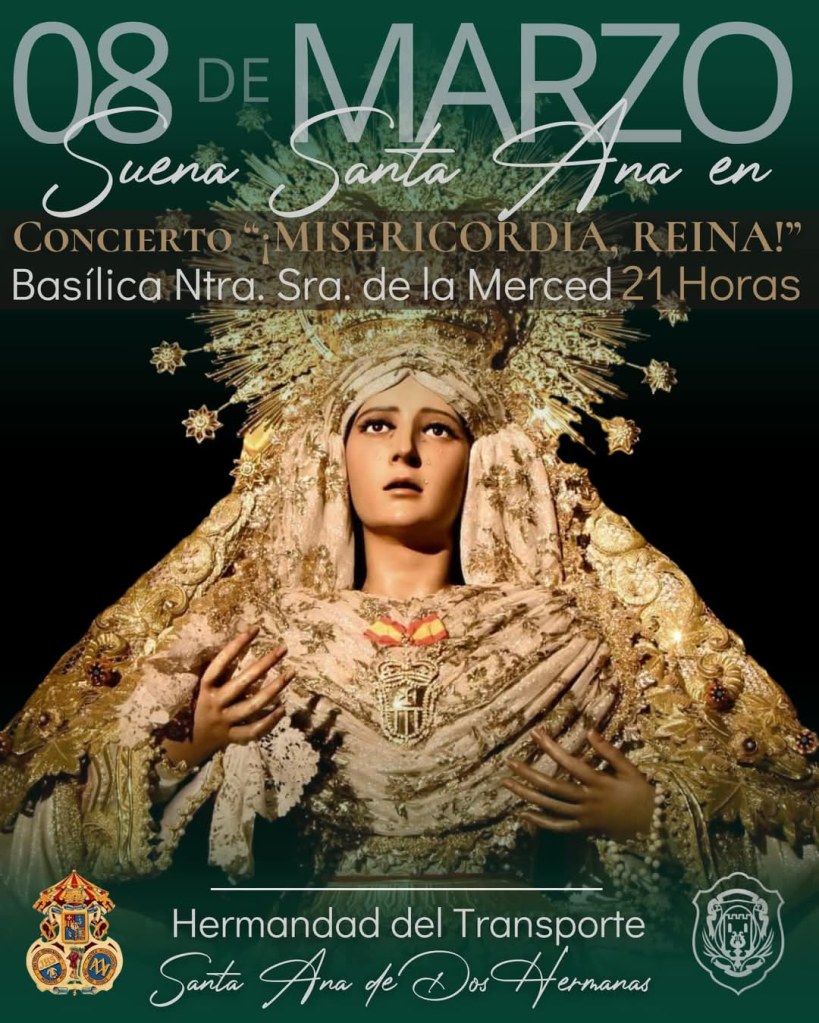 El próximo sábado 8 de marzo, a la finalización de la eucaristía del Solemne Quinario que estamos realizando a nuestros Sagrados Titulares, la Banda de Música Santa Ana de Dos Hermanas, ofrecerá un concierto de marchas procesionales en la Basílica de la Merced, y que tendrá como título «¡Misericordia, Reina!».