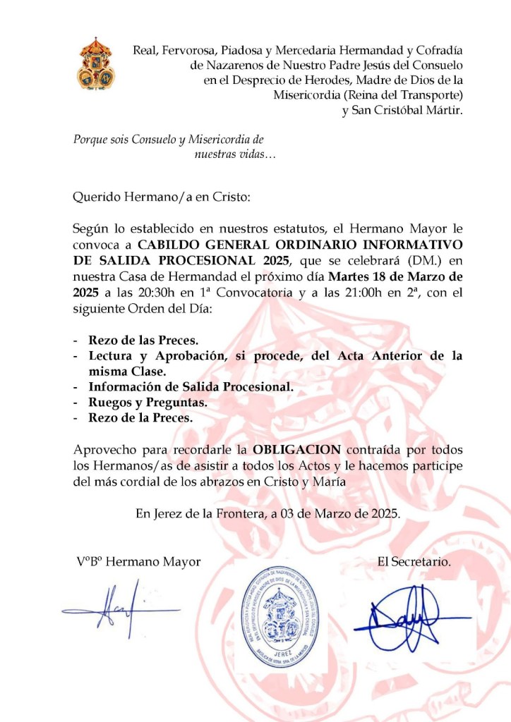 Según lo establecido en nuestros estatutos, el Hermano Mayor le convoca a CABILDO GENERAL ORDINARIO INFORMATIVO DE SALIDA PROCESIONAL 2025, que se celebrará (DM.) en la Casa de Hermandad sita en la calle Merced número 34 el próximo día martes 18 de marzo de 2025 a las 20:30h en 1ª Convocatoria y a las 21:00h en 2ª convocatoria, con el siguiente Orden del Día: