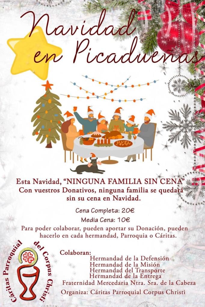 Desde Cáritas Parroquial del Corpus Christi nos trasladan esta preciosa iniciativa de cara a la celebración de las próximas fiestas navideñas, consistente en la recogida de donativos para que ninguna familia del Barrio de Picadueñas se quede sin su cena en Navidad.