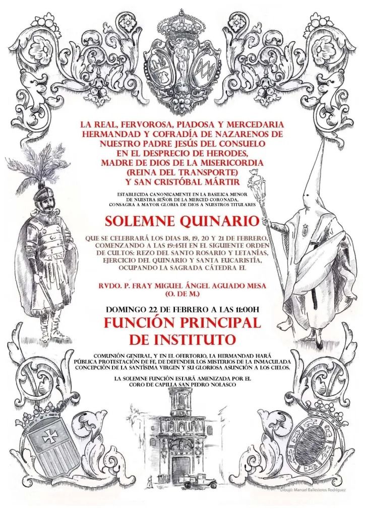 Dará comienzo a las 19:45h con el Rezo del Santo Rosario, Ejercicio del Quinario, y Eucaristía, ocupando la Sagrada Cátedra el Rvdo. Padre Fray Miguel Ángel Aguado Mesa, O. de M.