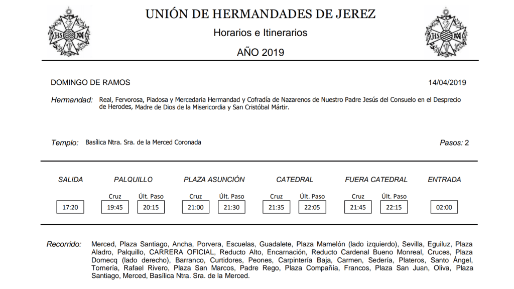 Este fue nuestro horario e itinerario oficial del Domingo de Ramos de 2019