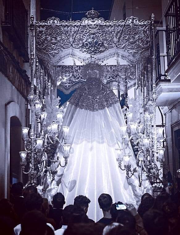 El techo del palio (adornado con estrellas de oro) y el manto son de tisú de plata, mientras que las bambalinas son de malla de oro bordadas que se complementan con cíngulos.
