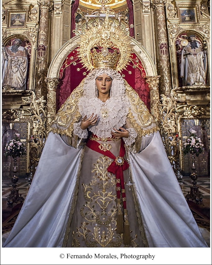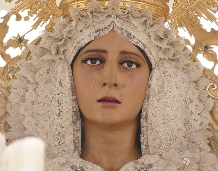 Su inconmensurable belleza la hace única en toda la ciudad. Destacan sus delicadas manos y su mirada serena, mientras que su tez morena contrasta sobremanera con la blancura de su manto y palio.